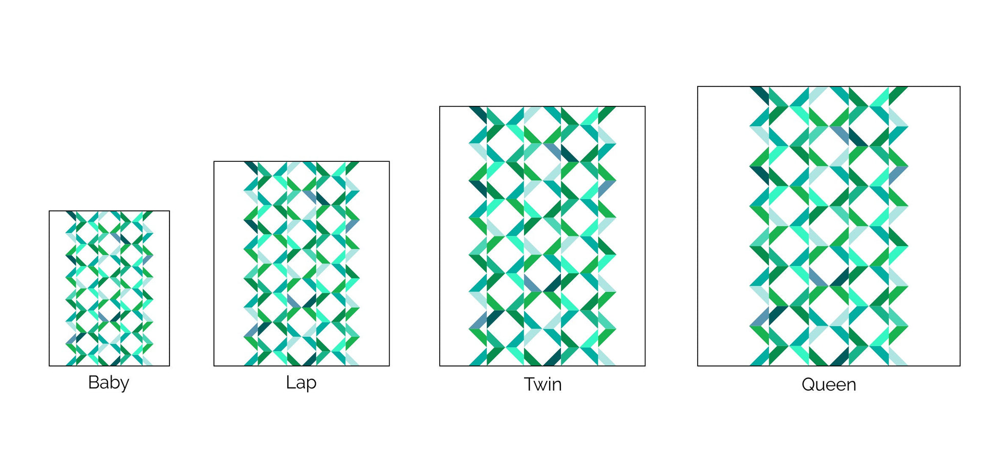 The pattern includes instructions for four sizes: baby, lap, twin, and queen. See the pictures above for illustrations of the different sizes and fabric requirements for each size.