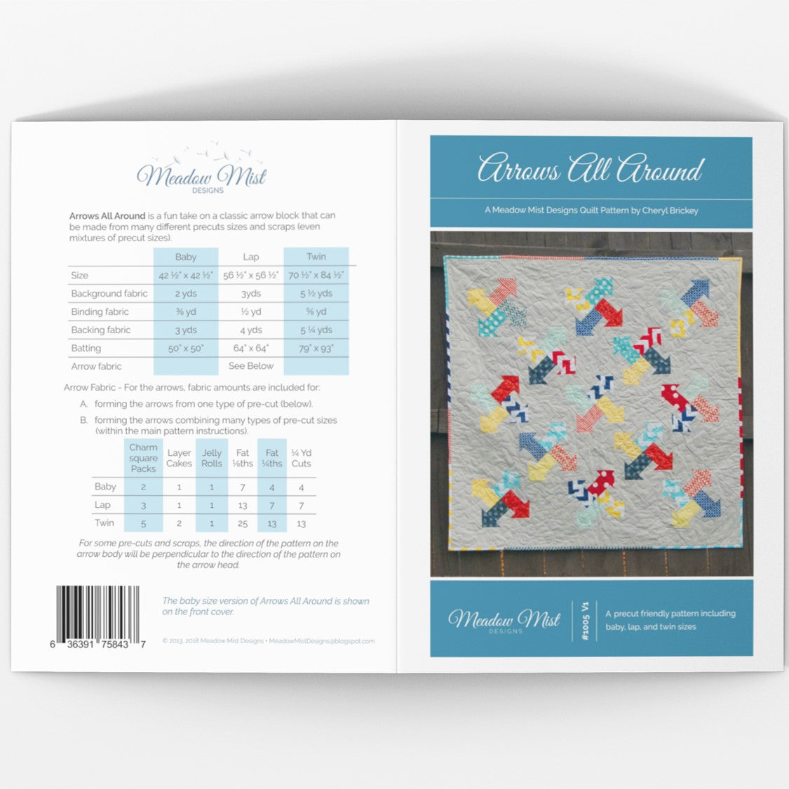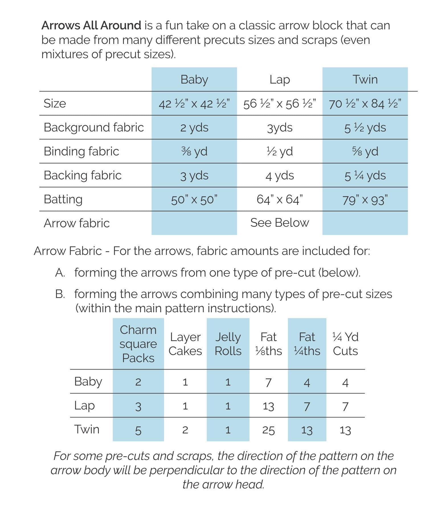 Arrows All Around is a great quilt pattern for using your favorite pre-cuts and scraps and includes directions for baby, lap, and twin sizes. The pattern includes cutting instructions for almost all types of pre-cuts including charm squares, layer cakes, jelly rolls, fat eighths, fat quarters, ¼ yard cuts as well as how to combine different pre-cut sizes and scraps to make the arrows.
