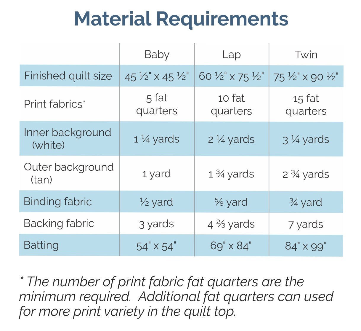 The pattern includes instructions for three sizes: baby, lap, and twin. See the pictures above for illustrations of the different sizes and fabric requirements for each size.