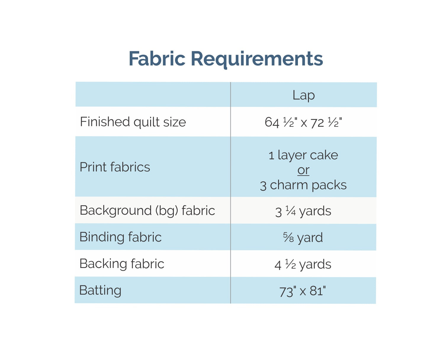 See the pictures above for the fabric requirements for the lap sized quilt.