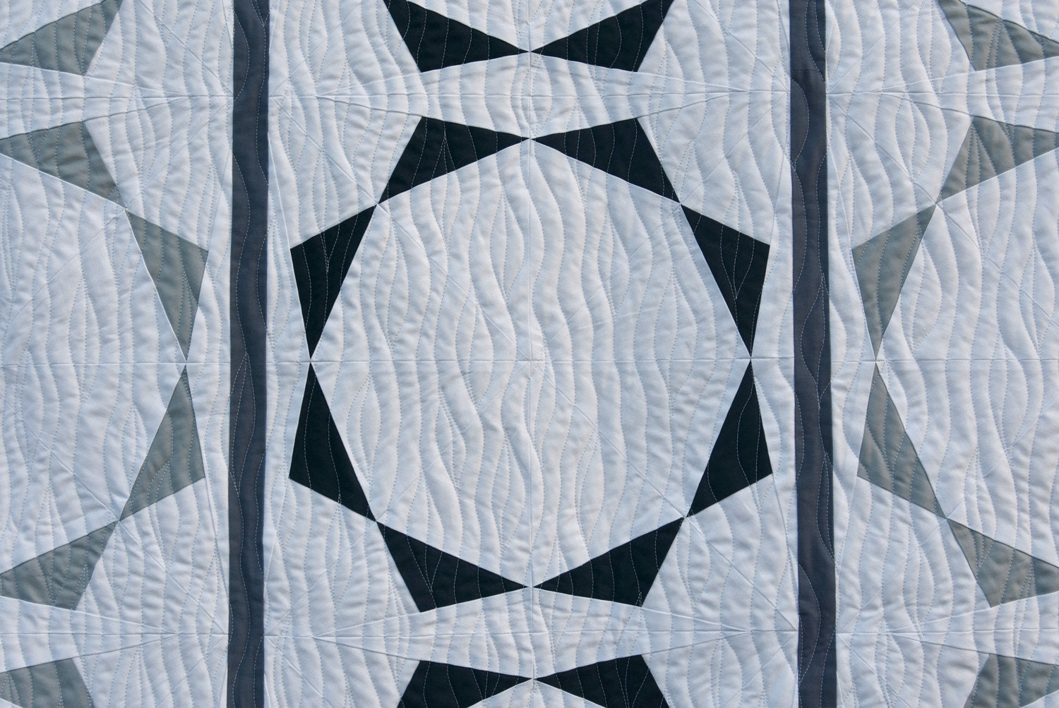 The cover version of Half Circle Mirror used Kona Cotton Solids by Robert Kaufman in Pepper (Fabric A), Charcoal (Fabric B), Titanium (Fabric C), and White (Background Fabric) and was quilted by Johellen George of Cabin Quilt Studio.