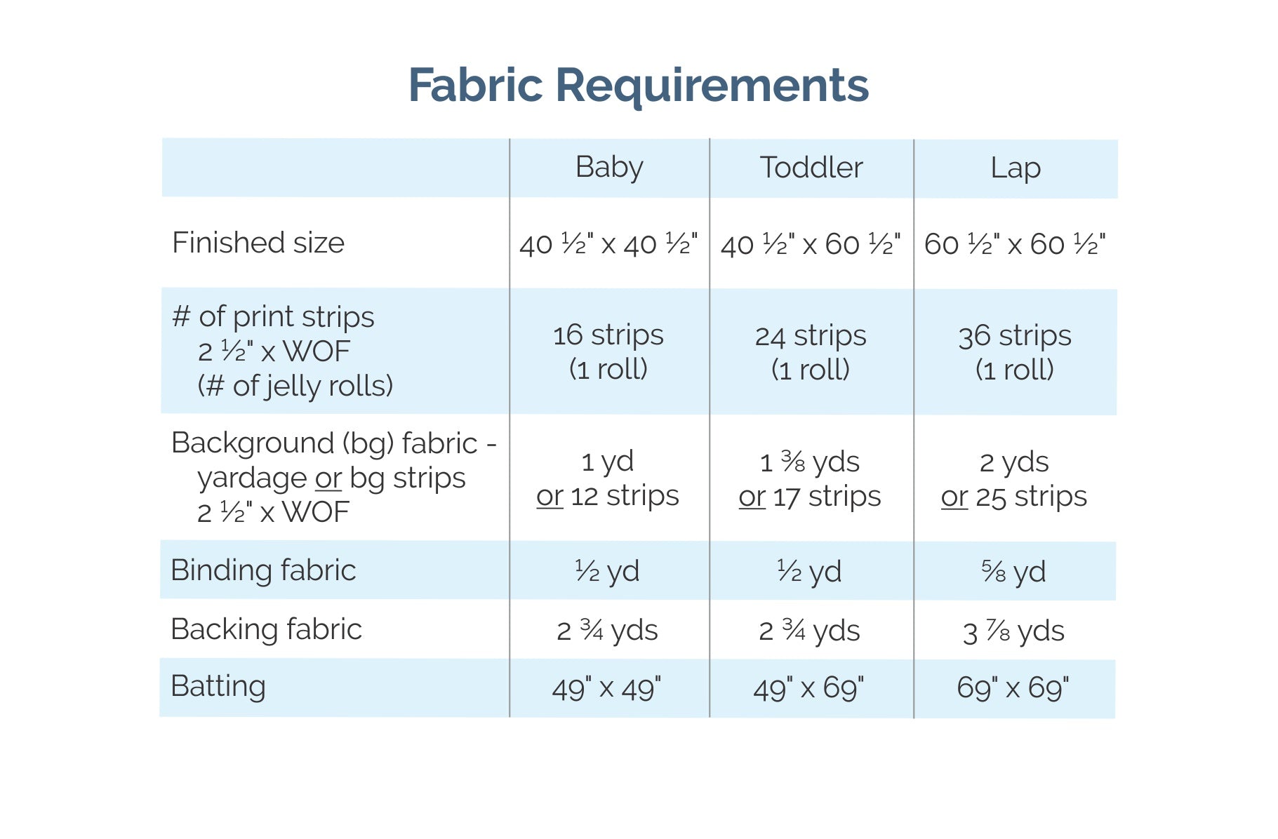 The quilt pattern includes instructions for baby, toddler, and lap sized quilts.