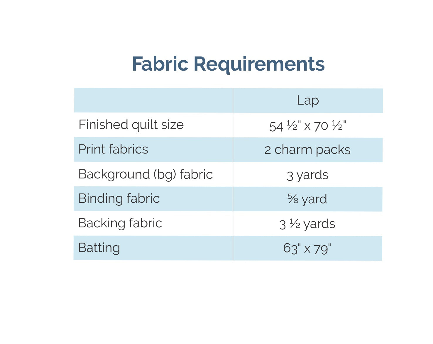 See the pictures above for the fabric requirements for the lap sized quilt.