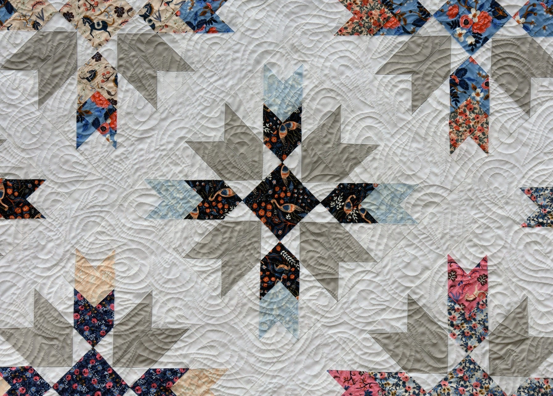 The cover version of the quilt was made using the Les Fleurs collection by Rifle Paper Co. for Cotton + Steel on a white fabric background, Warm & White batting by the Warm Company, and Aurifil thread. A coloring diagram of the quilt top is included to audition possible color schemes.