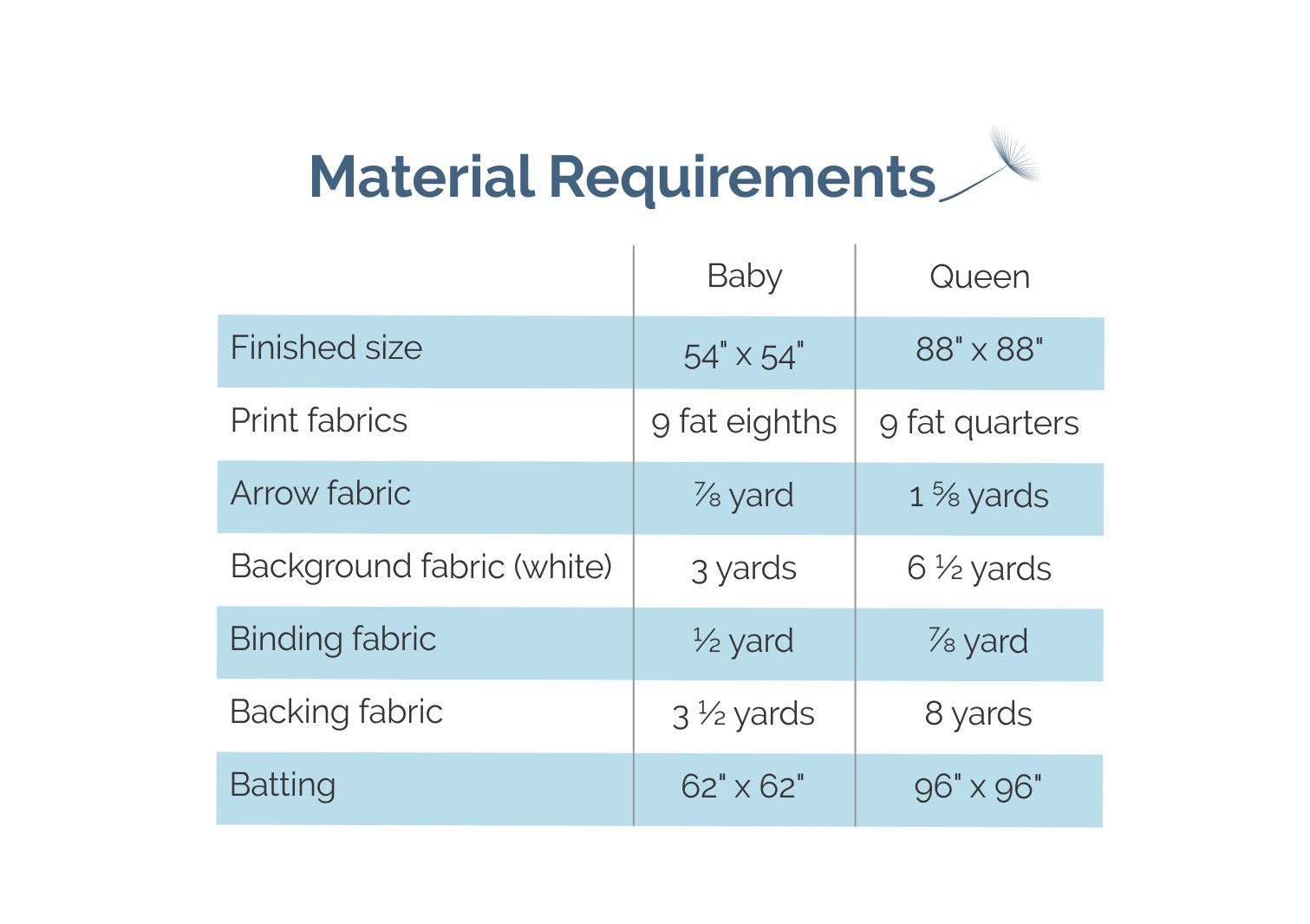 The pattern includes instructions for two sizes: baby and queen. Both sizes have the same design and layout (same number of blocks), with the queen sized blocks and sashing scaled up. See the pictures for the fabric requirements for each size.