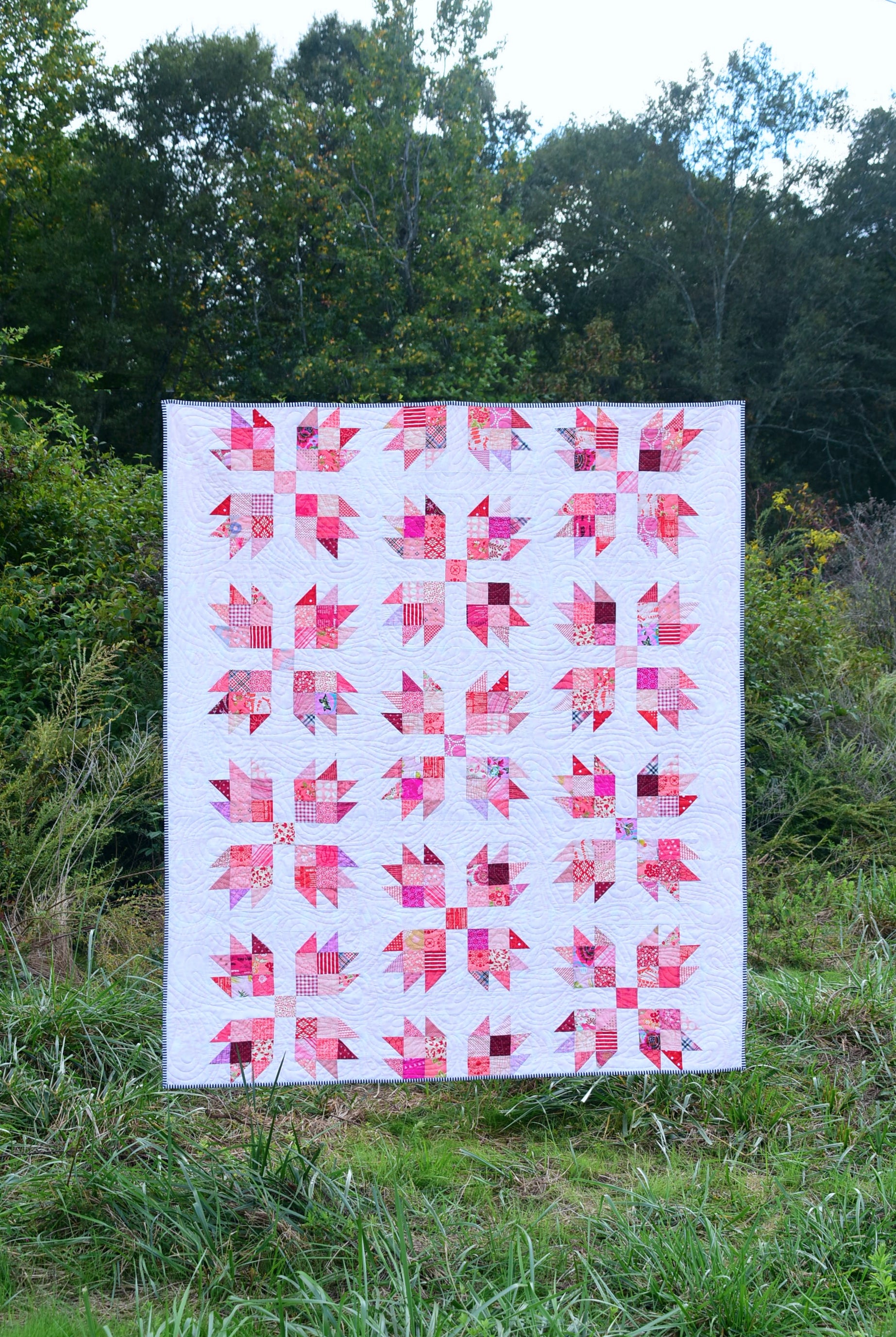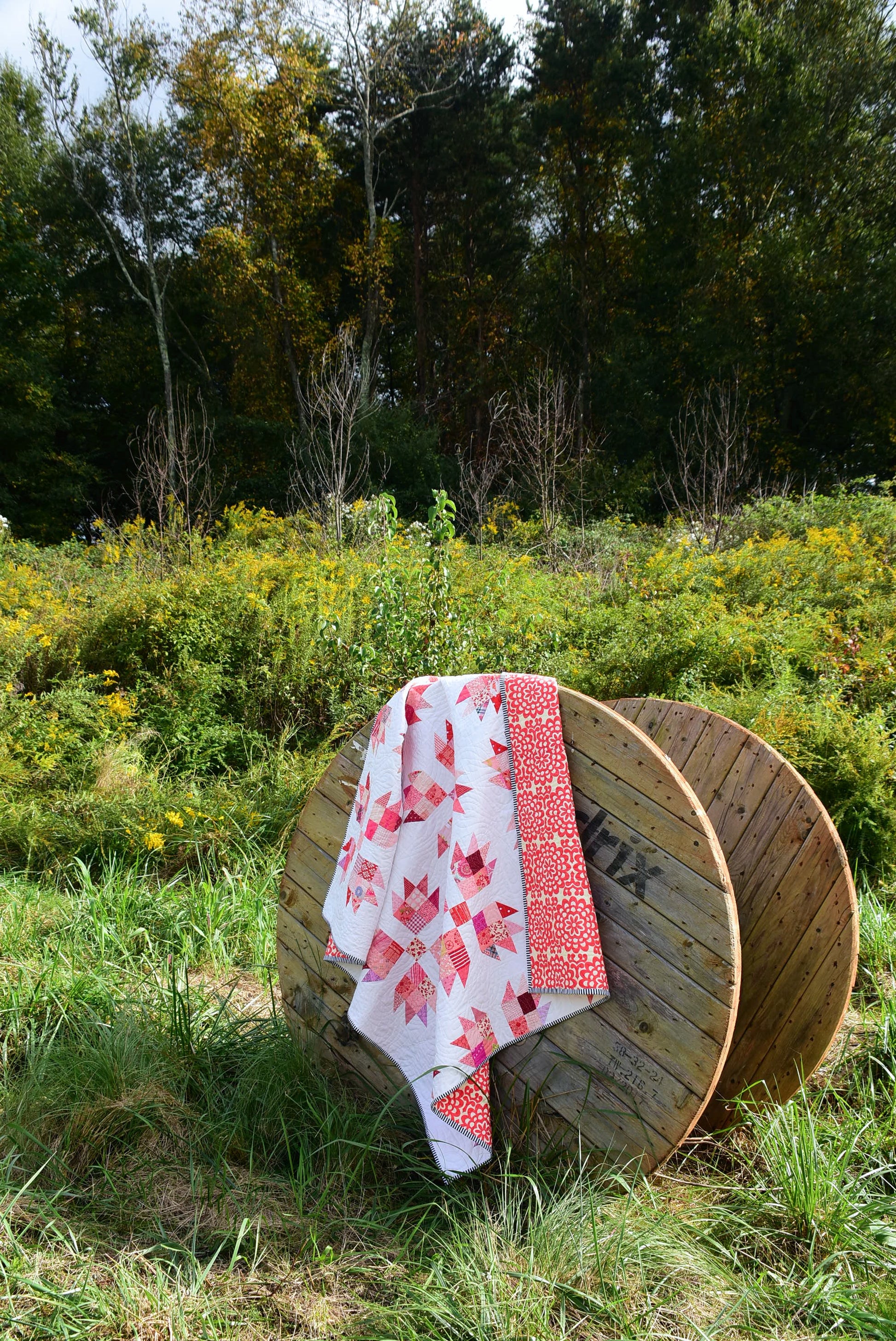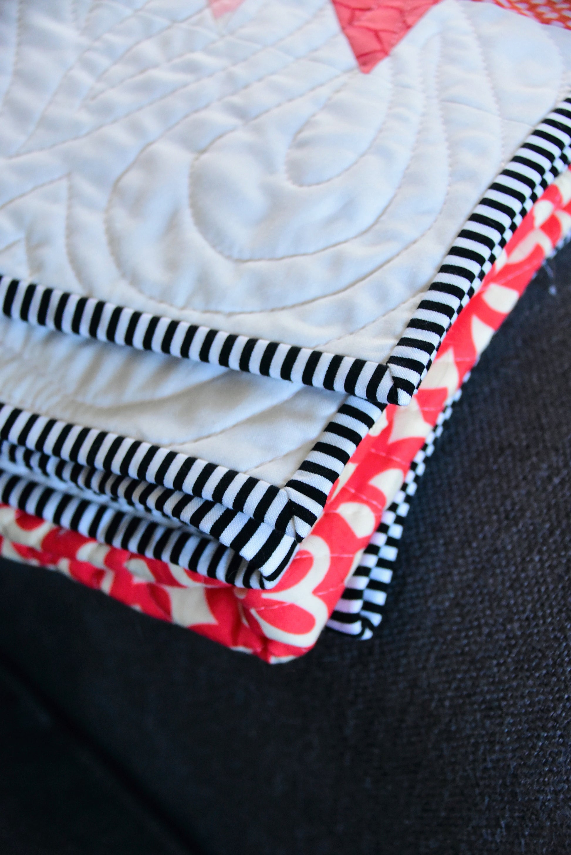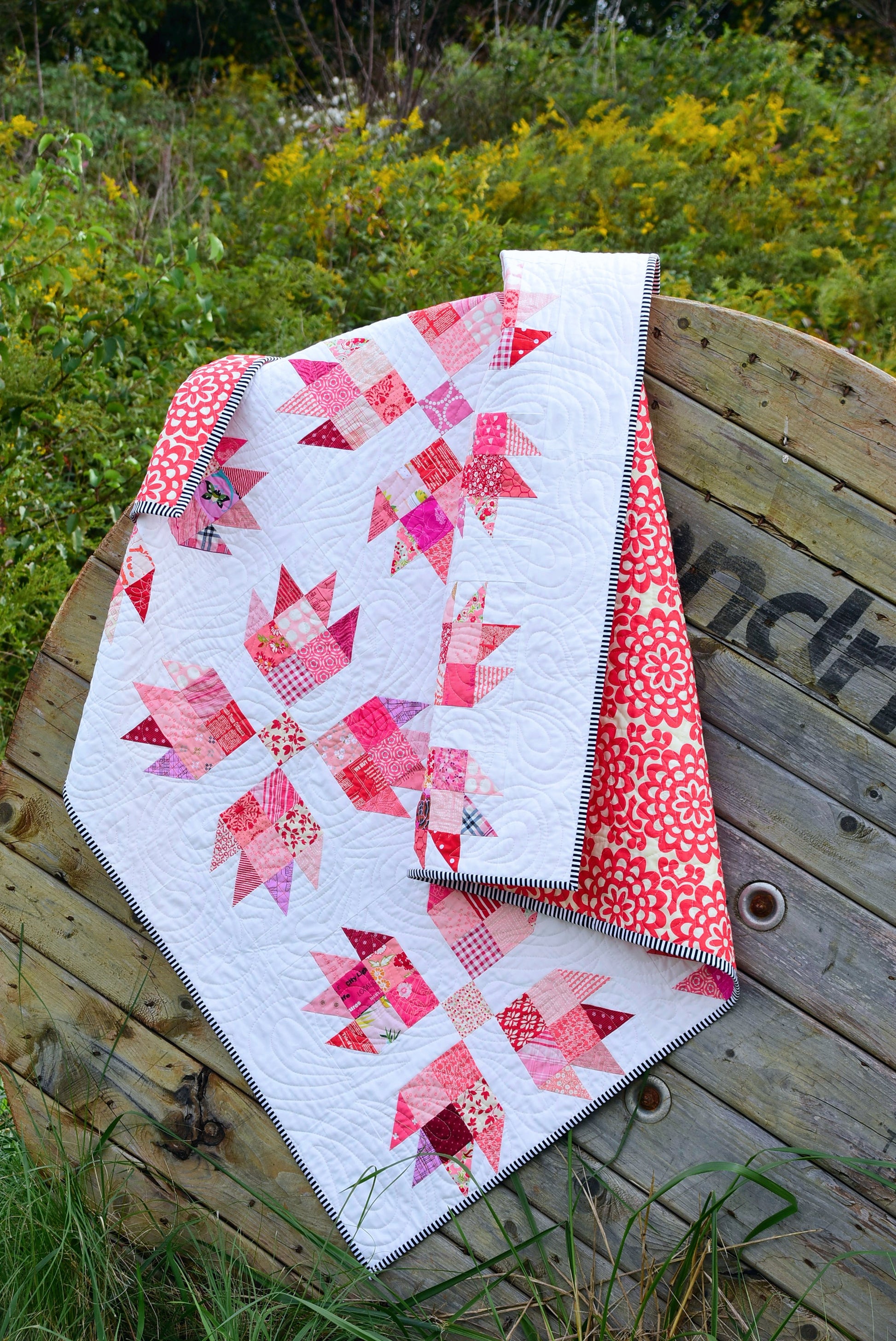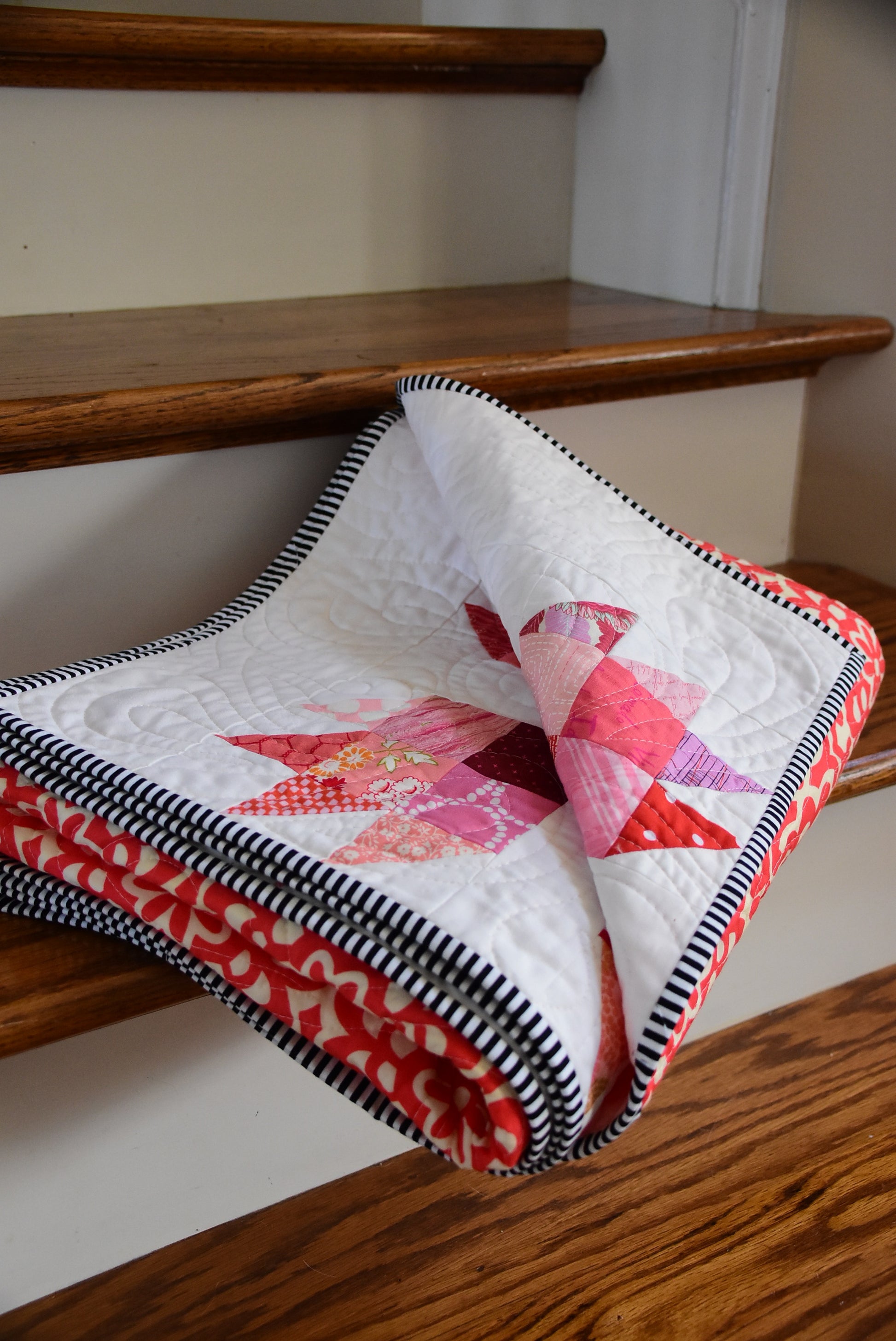 The cover quilt was made using red and pink print fabric scraps, Warm & White batting by The Warm Company, and was pieced and quilted using Aurifil thread.