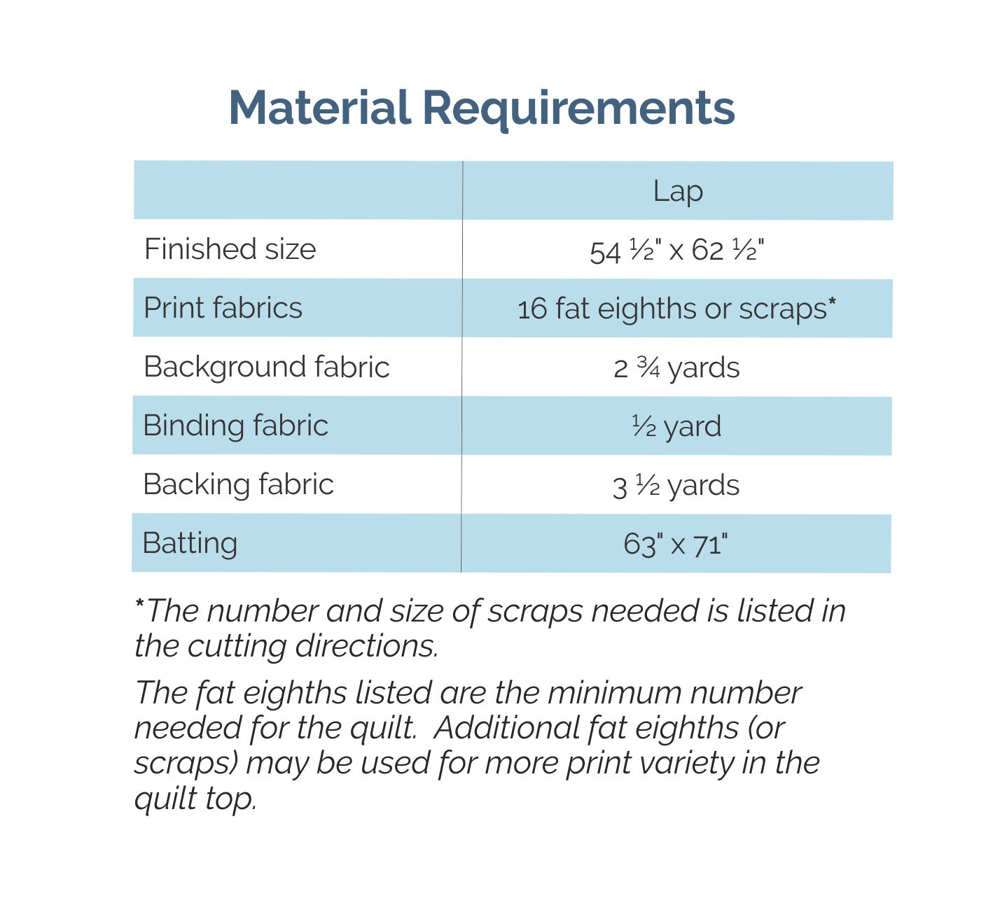 The pattern includes instructions for a lap sized quilt. See the pictures above for the fabric requirements.