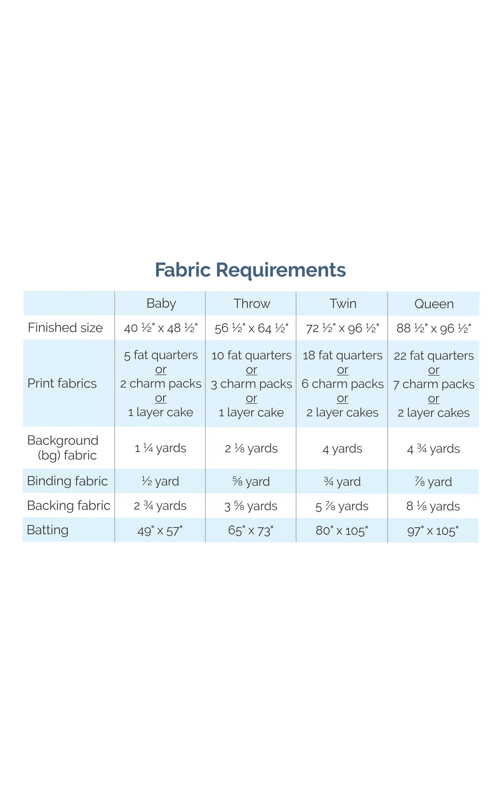The full color quilt pattern also contains a coloring page to test out color schemes and quilting designs. See the pictures for the fabric requirements and renderings of the different sizes.