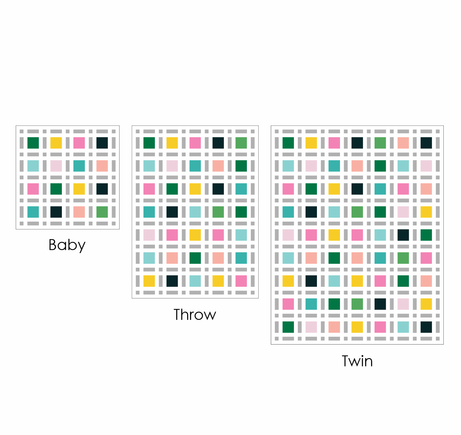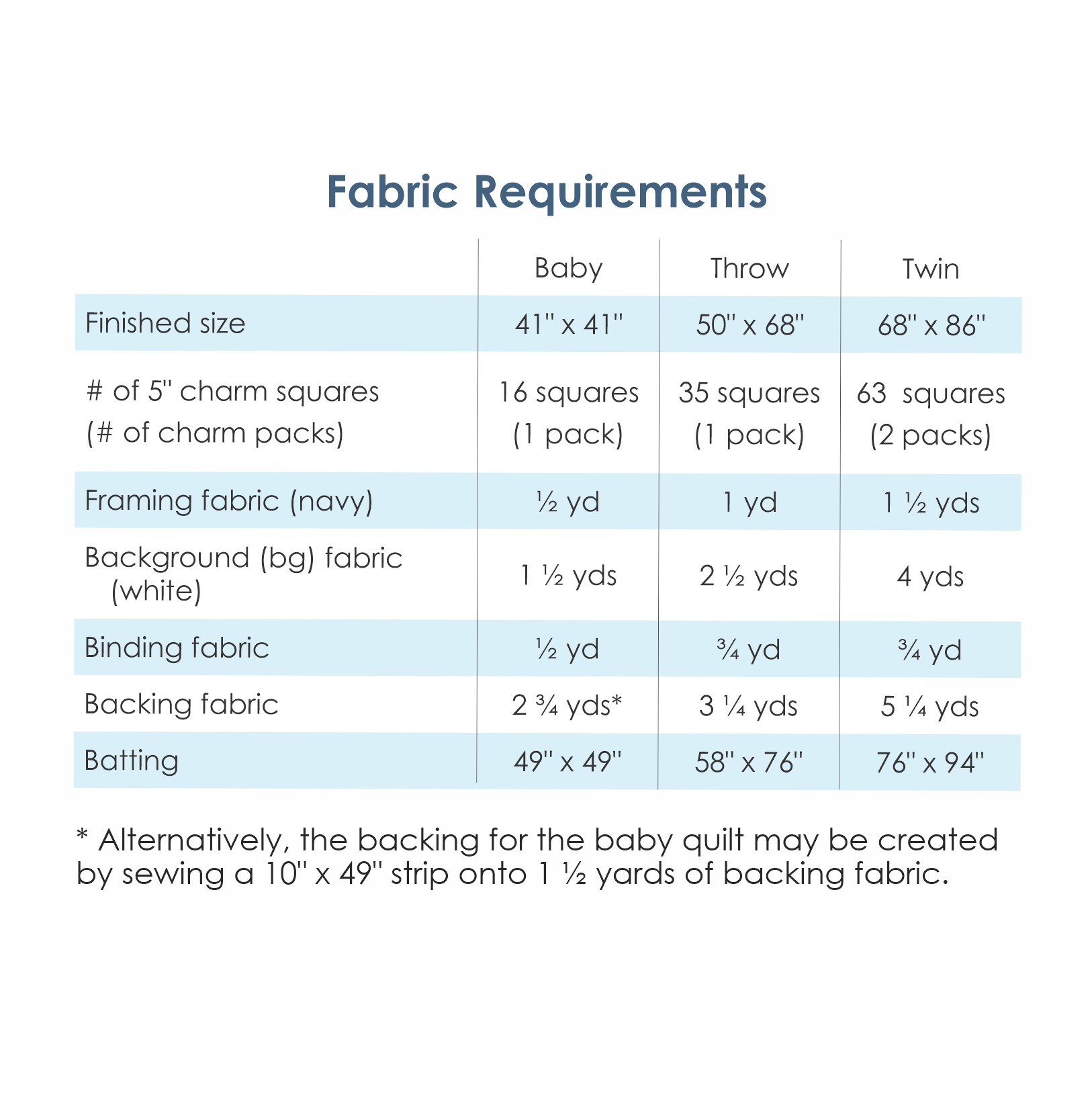 The fabric requirements can be found in the pictures above. The quilt pattern includes instructions for baby, lap, and twin sized quilts.