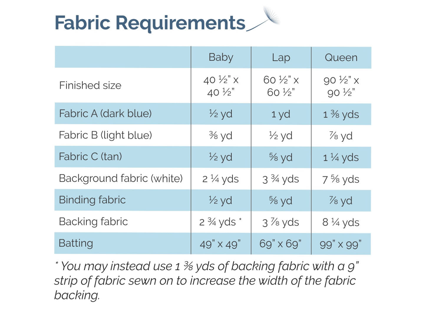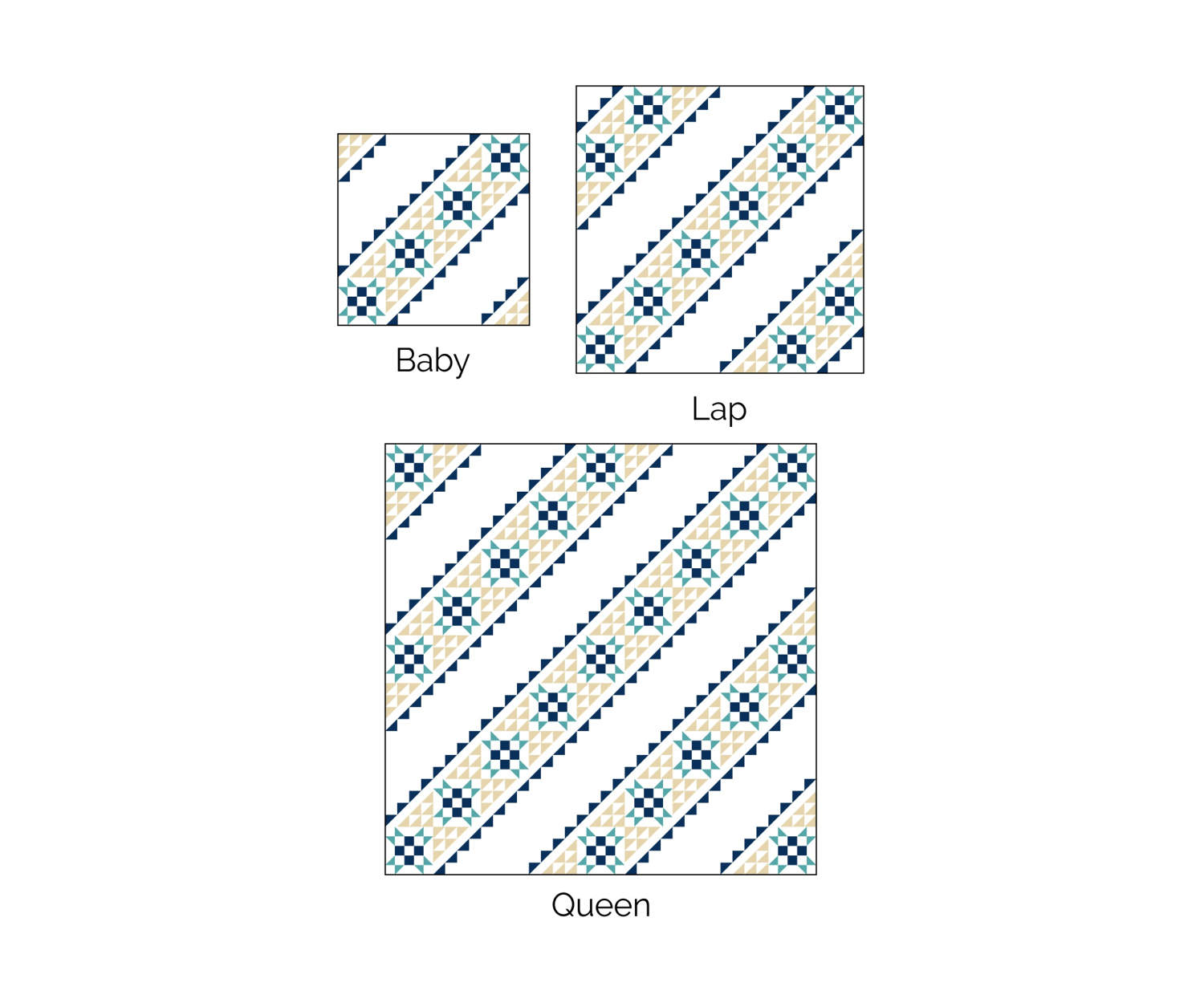 The pattern includes instructions for three sizes: baby, lap, and queen. See the pictures above for illustrations of the different sizes and fabric requirements for each size.
