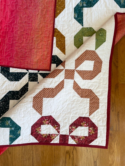 See the pictures for the fabric requirements and renderings of the different colorways. The throw sized, two color cover quilt was made using FreeSpirit Solids in Red and Winter White and the multi-color quilt was made using Natalie by Giucy Giuce for Andover Fabrics.