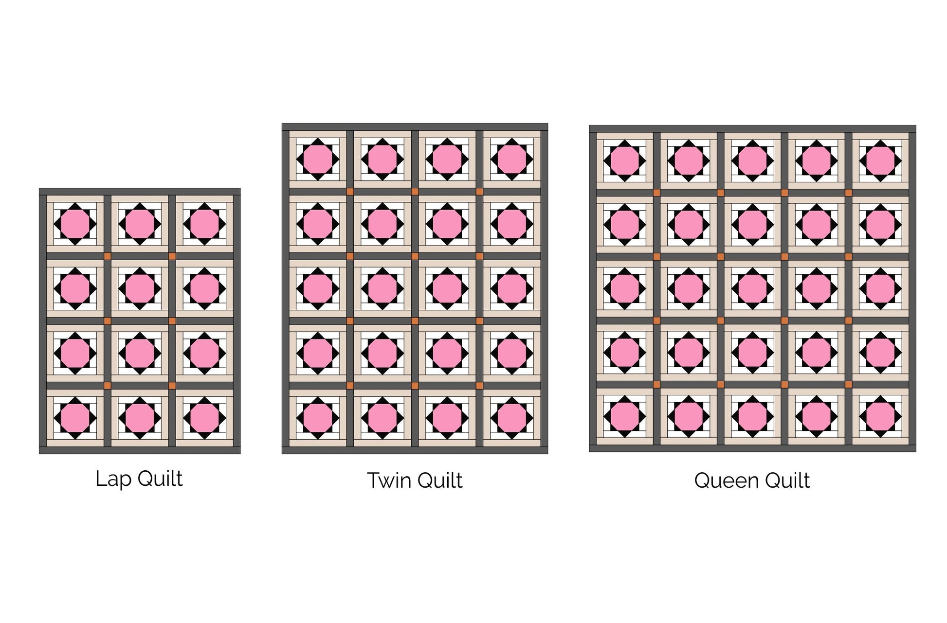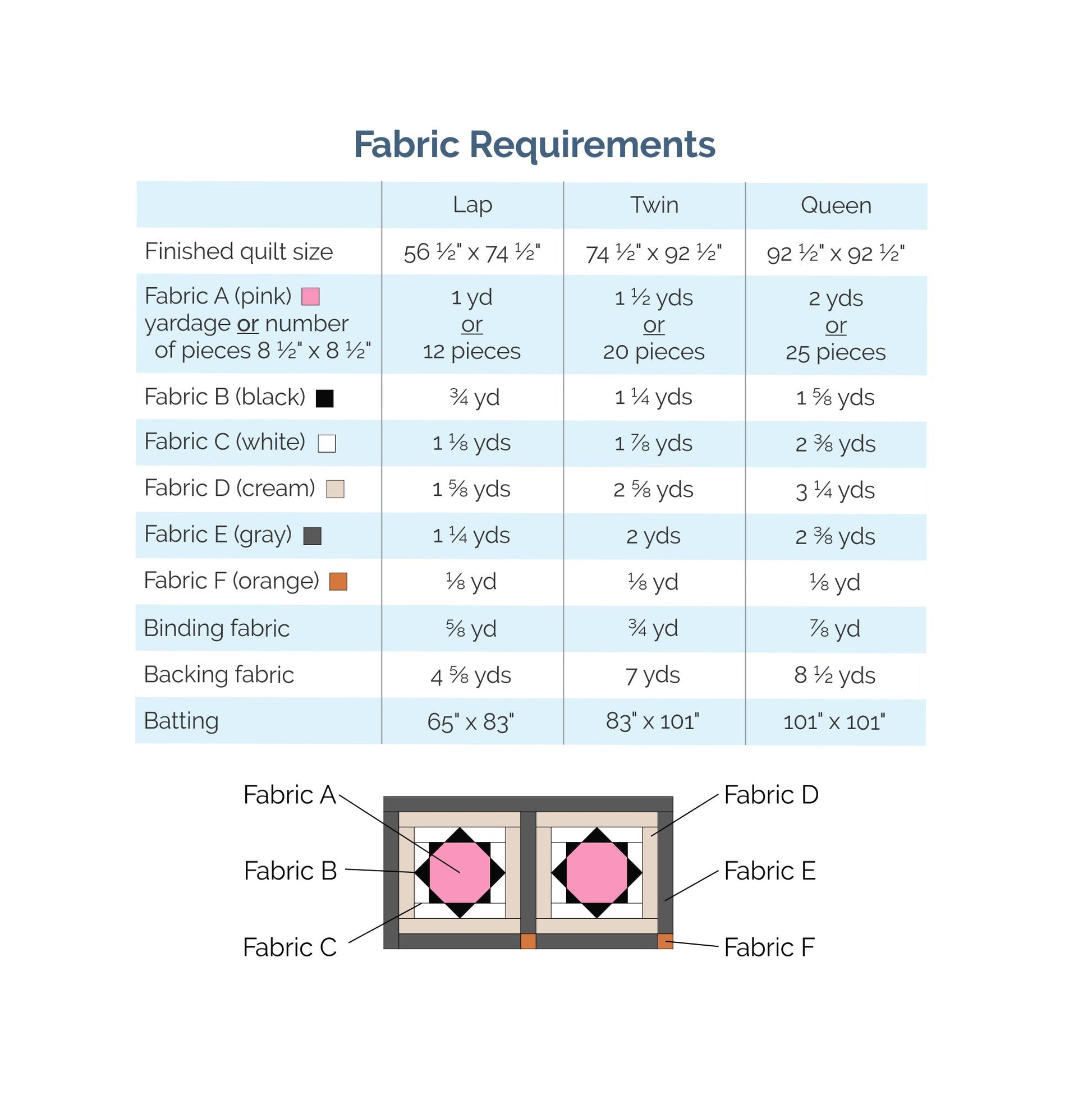 The pattern includes instructions for three sizes: lap, twin, and queen. See the pictures above for illustrations of the different sizes and fabric requirements for each size.