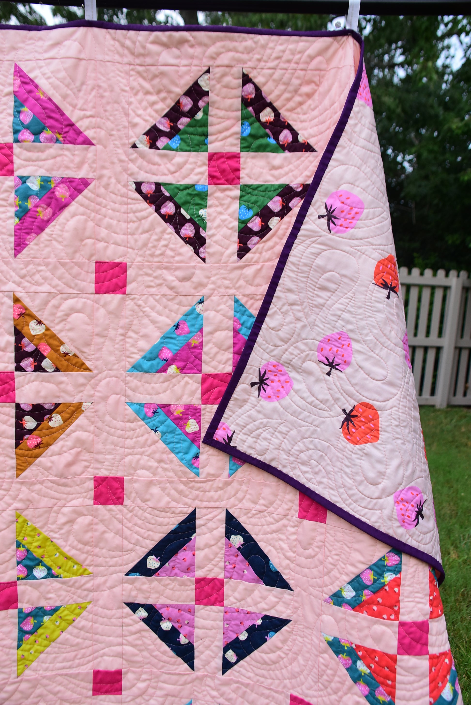 The throw sized cover quilt was made using the Strawberry Collection by Kimberly Kight for Ruby Star Society with Moda Bella solids in Shocking Pink and Bubble Gum.