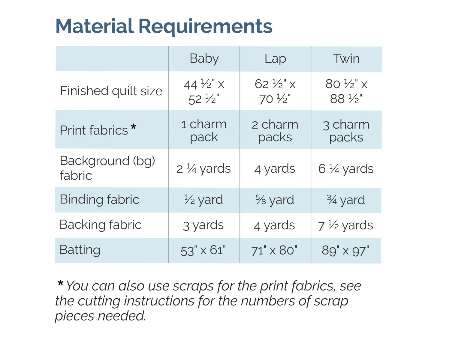 The pattern includes instructions for three sizes: baby, lap, and twin. See the pictures above for illustrations of the different sizes and fabric requirements for each size.