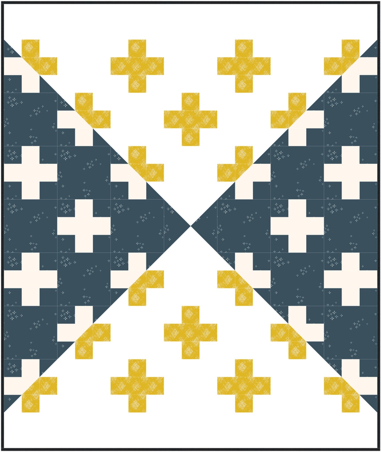 Isosceles Addition combines plus signs with a large overall hourglass shape for a quilt that comes together quickly and has great visual impact. The cover version (lap size) of the quilt was made from Kona Cotton Solids by Robert Kaufman in honeysuckle, chartreuse, and white, Warm & White batting by The Warm Company, and Aurifil thread. A coloring diagram of the quilt top is included to audition possible color schemes.