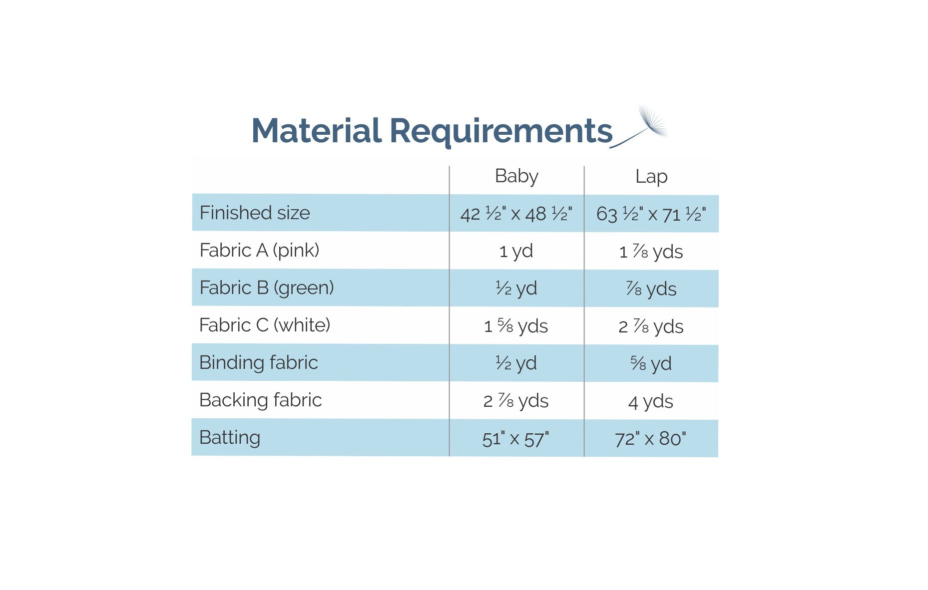 The pattern includes instructions for two sizes: baby and lap. See the pictures for illustrations of the different sizes and fabric requirements for each size.
