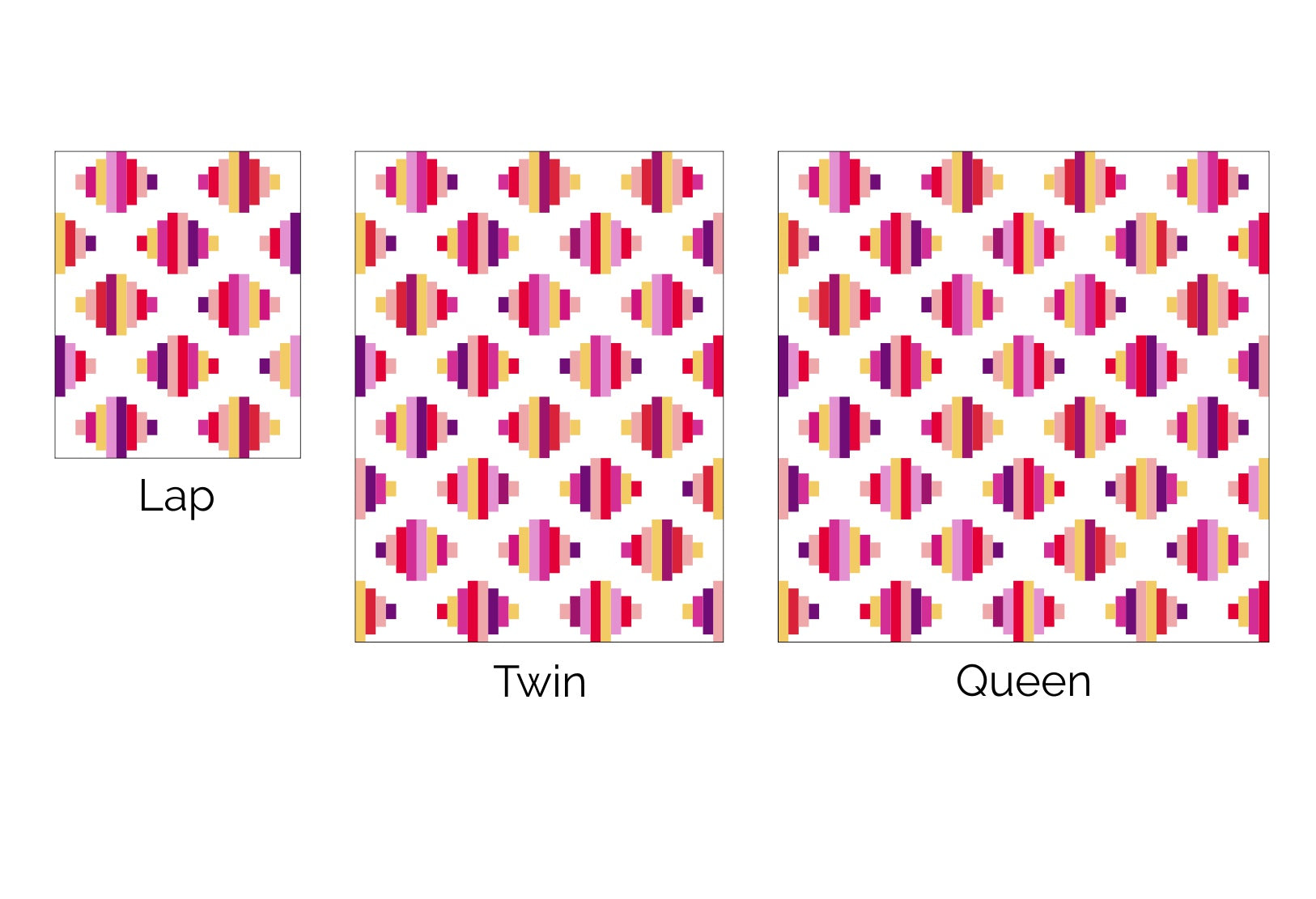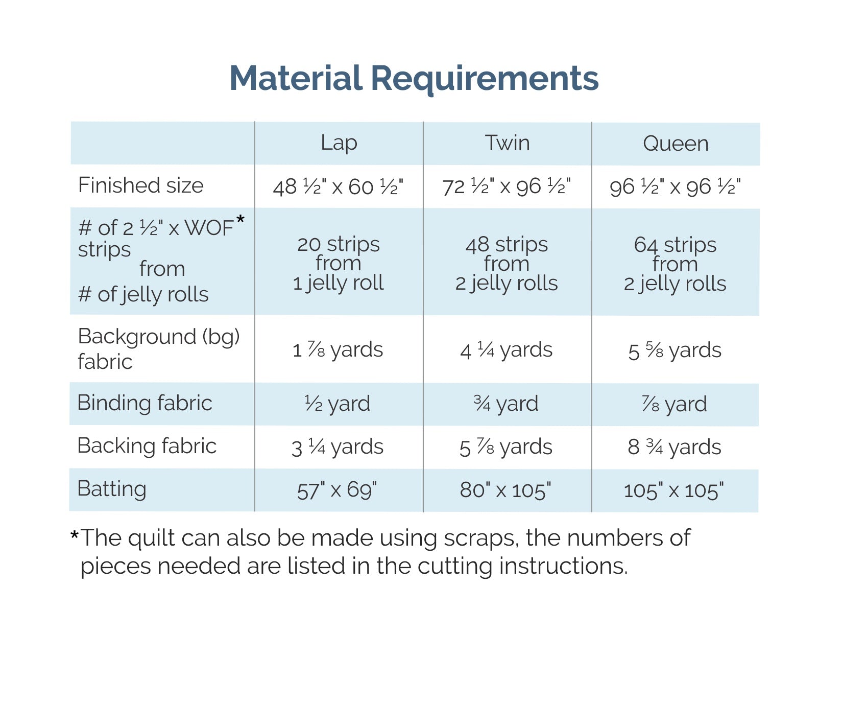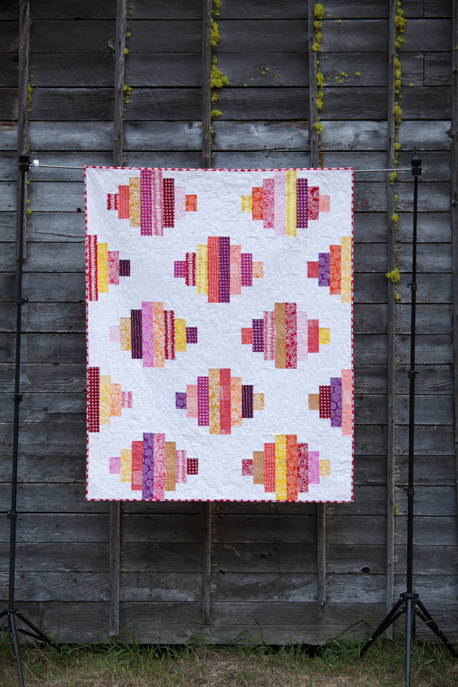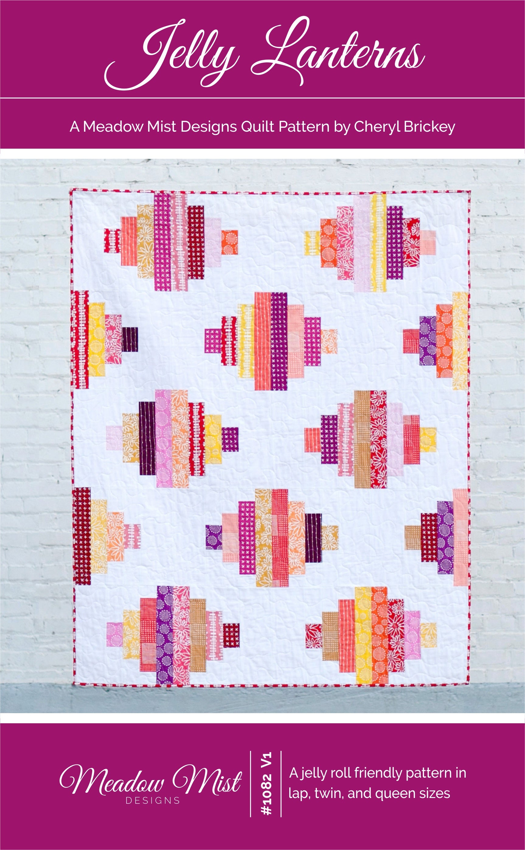 Jelly Lanterns is a beginner level, jelly roll friendly pattern that creates lantern like shapes when the blocks are sewn together. The pattern contains instructions for three sizes: lap, twin, and queen.