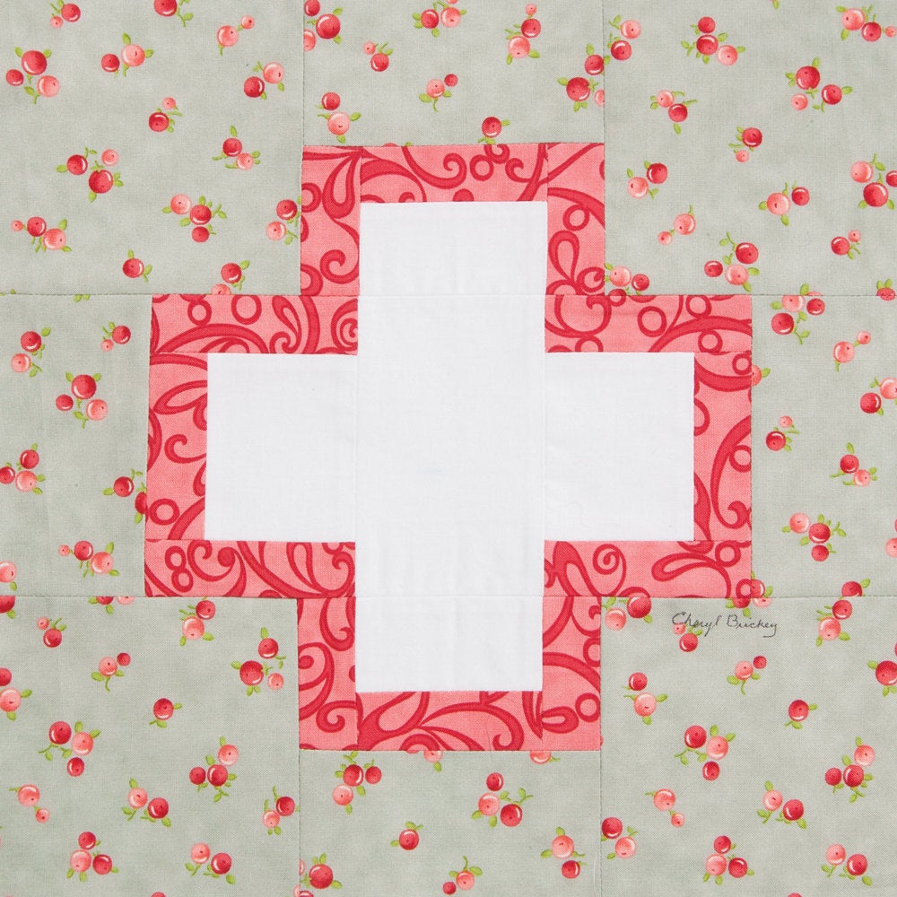 Cover quilt pieced and quilted by Jackie Padesky using various floral prints by Bonnie and Camille for Moda.  To make Jackie’s cover version, you would use the single fabric instructions for the plus section and the multi-fabric instructions for the outline and background sections.