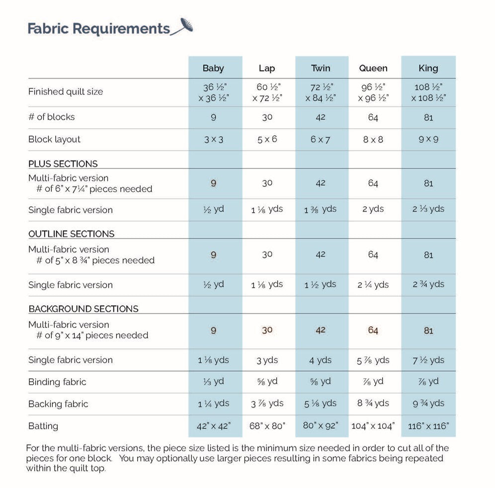 The quilt pattern includes instructions for 5 sized quilted - baby, lap, twin, queen, and king sizes. The materials needed for the quilt can be found in the pictures.