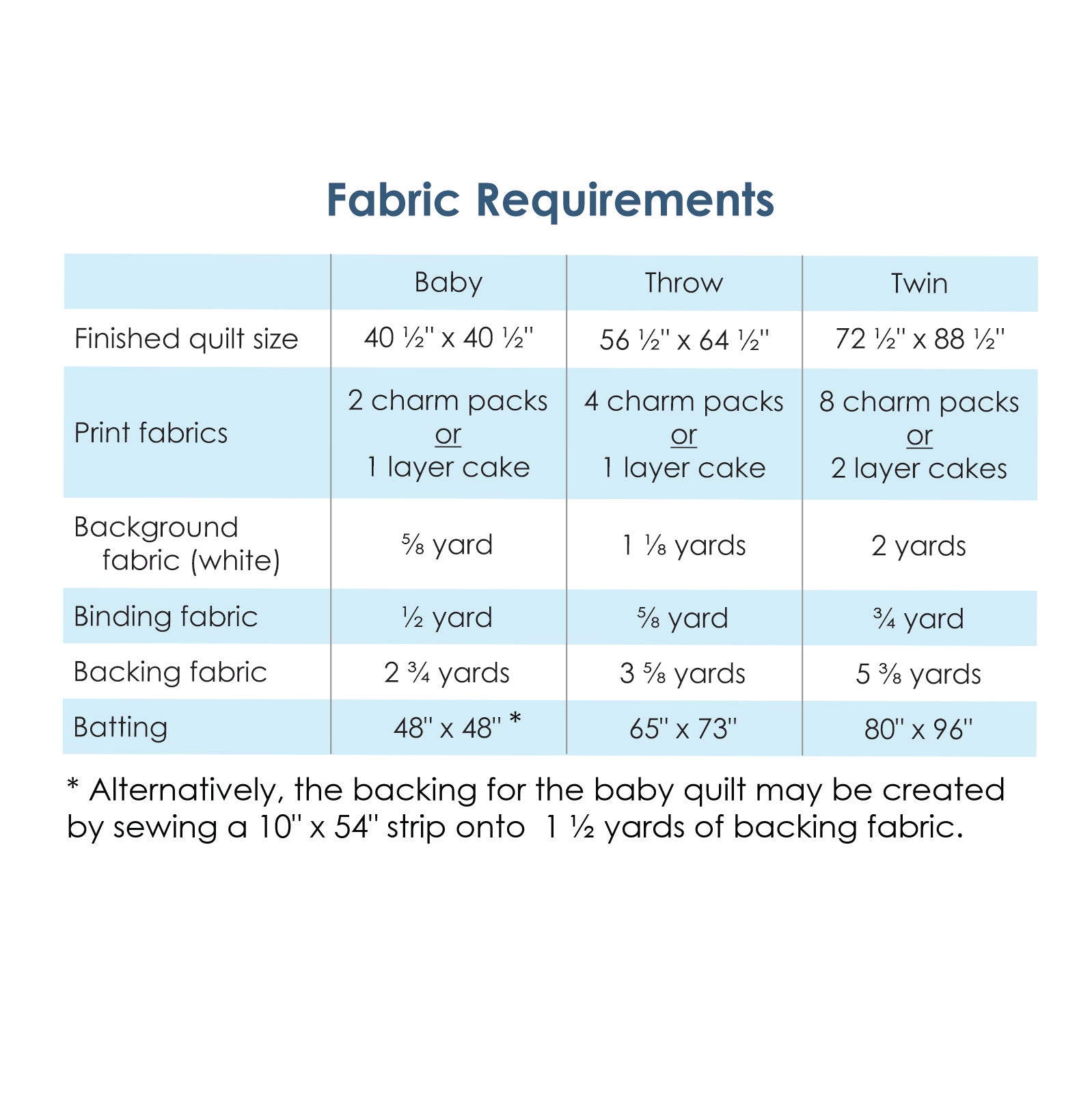 The quilt pattern includes instructions for baby, lap, and twin sizes.