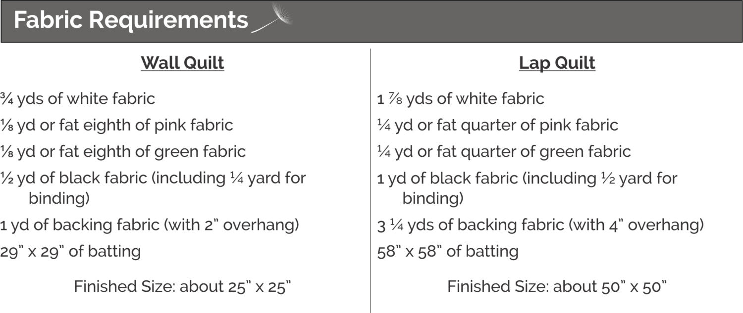 The pattern includes instructions for wall and lap sized quilts.The materials needed for the quilt can be found in the pictures.