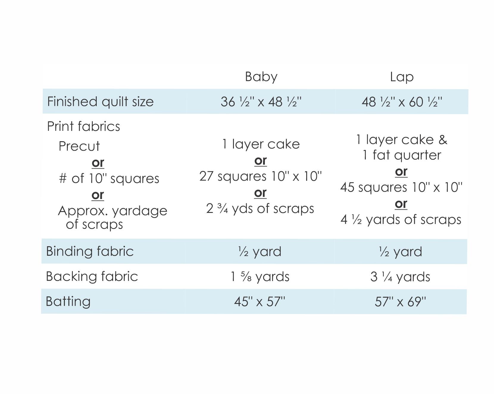 The quilt pattern includes instructions for baby and lap quilt sizes and the fabric requirements can be found in the pictures.