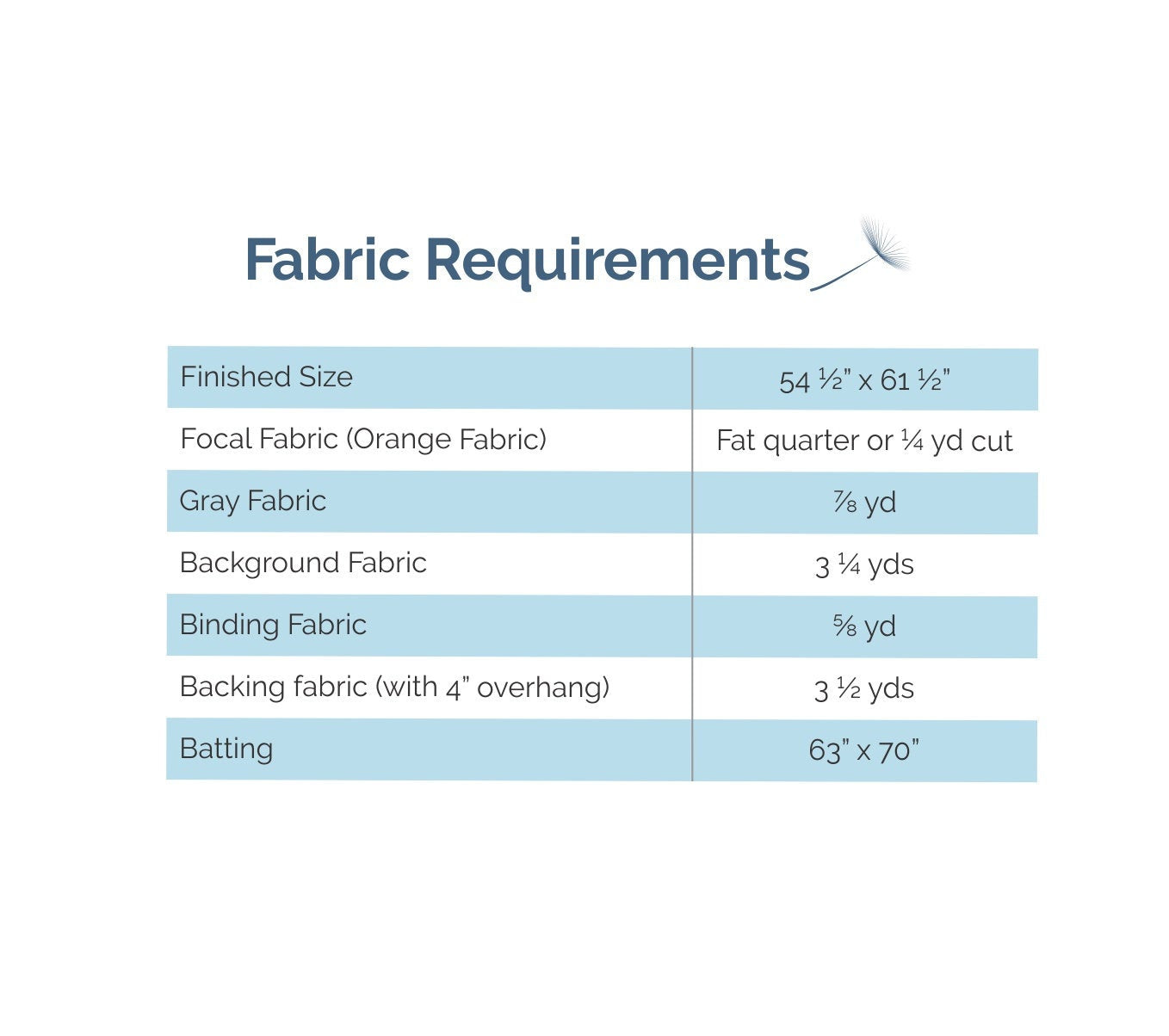 The quilt pattern includes instructions to make a lap sized quilt, 54 ½" x 61 ½". The materials needed for the quilt can be found in the pictures.