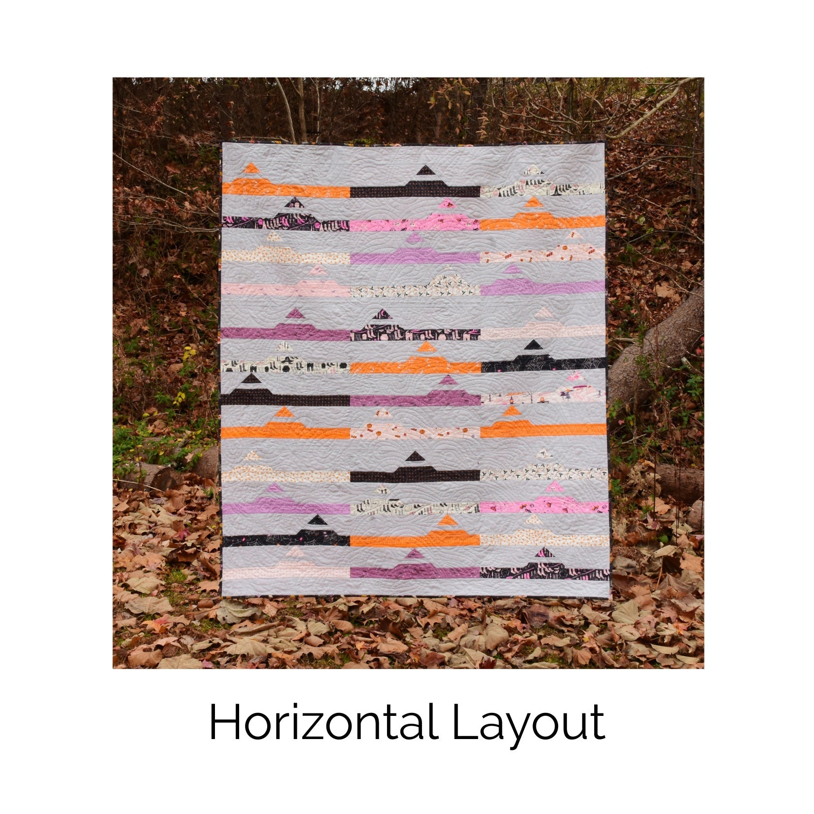 Swamp Rabbit Trail contains piecing instructions for two different layouts, a horizontal layout and a vertical layout. Each layout uses the same number and size of blocks but differs in the block orientation, sashing, and borders.