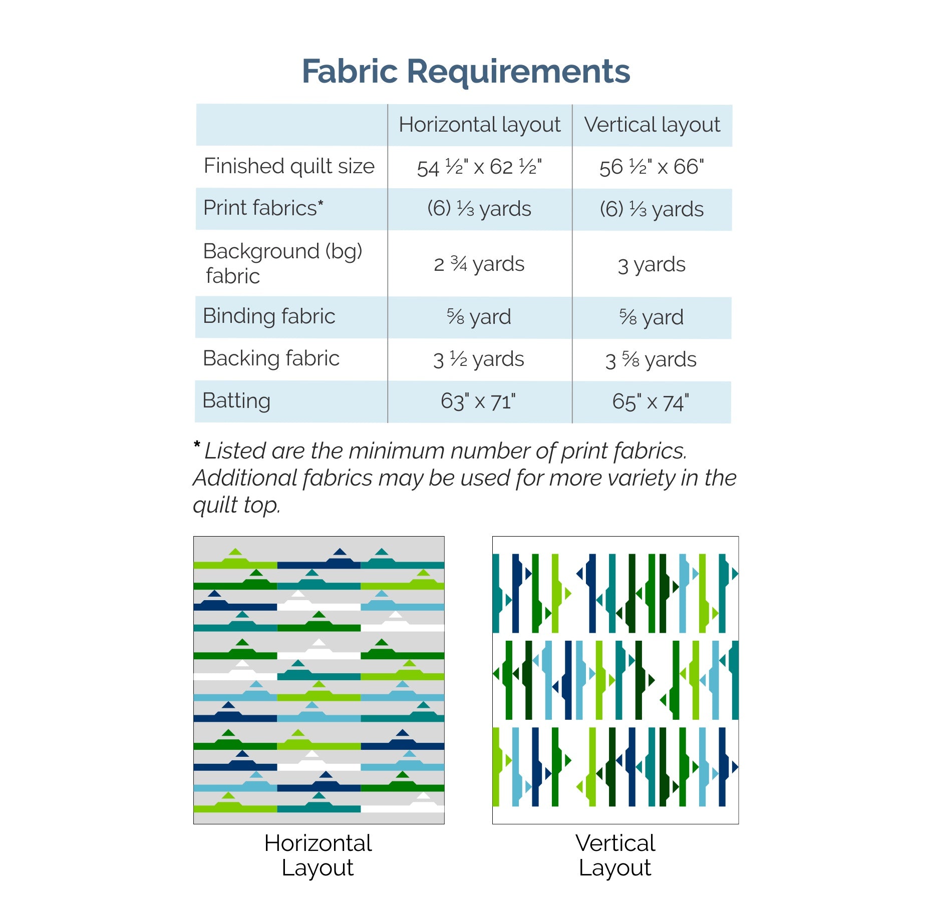 See the pictures above for illustrations of the different layouts and fabric requirements.
