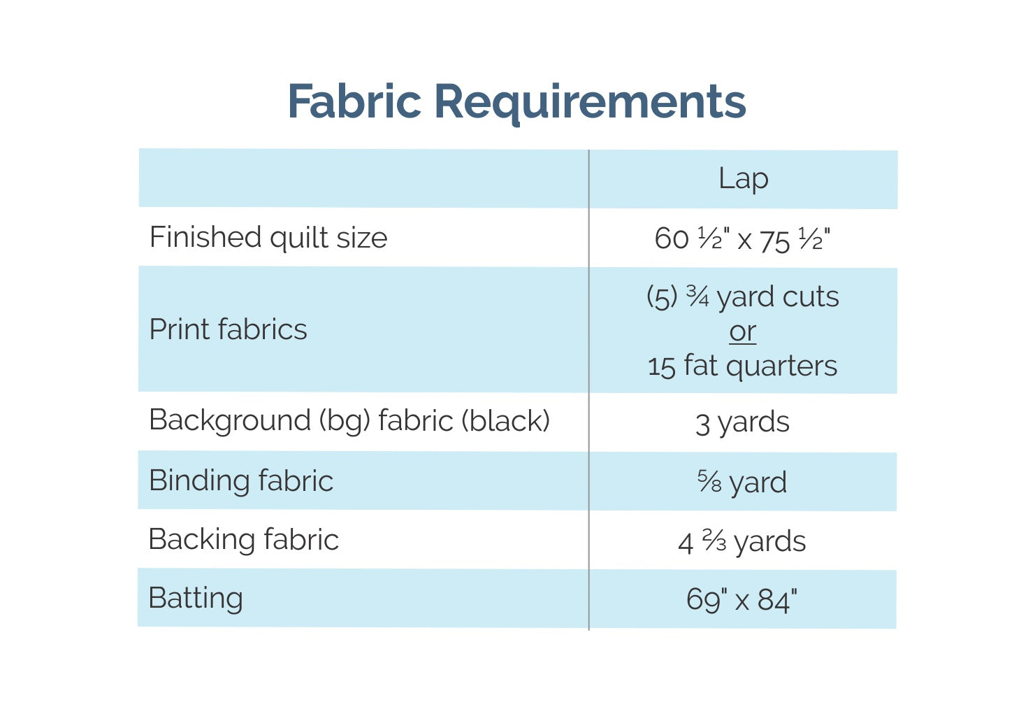 The pattern includes instructions for a throw sized quilt 60 ½" x 75 ½". See the pictures above for fabric requirements.