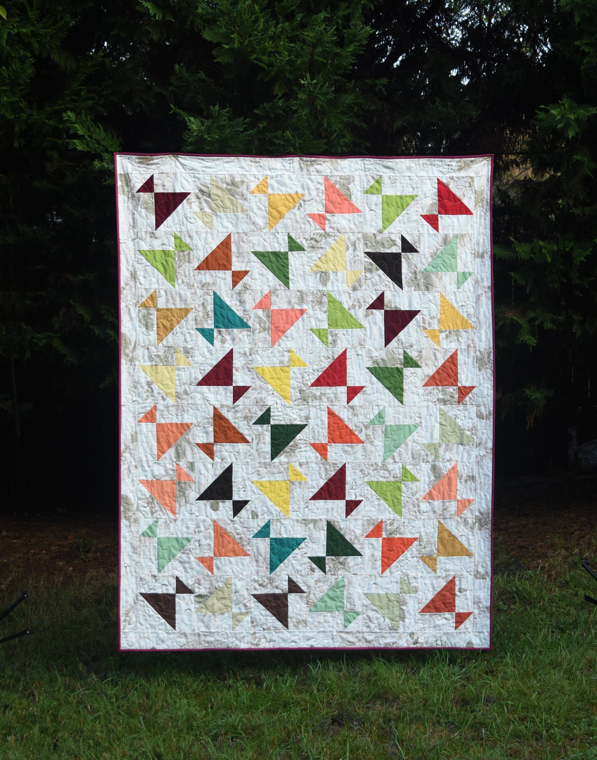 The cover version of the quilt was made using fall inspired solids by American Made Brand Solids and a cream print for the background. With these colors, the design resembles falling leaves in fall.