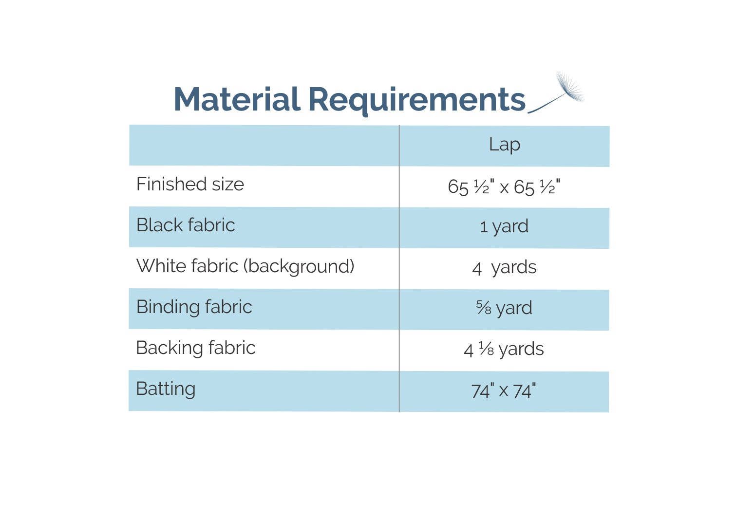 The pattern includes instructions for a lap sized quilt, 65 ½" x 65 ½". See the pictures for fabric requirements.